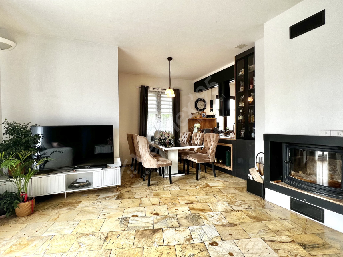 Parter: przestronny salon z kominkiem i jadalnią, jasna kuchnia, sypialnia z garderobą, łazienka