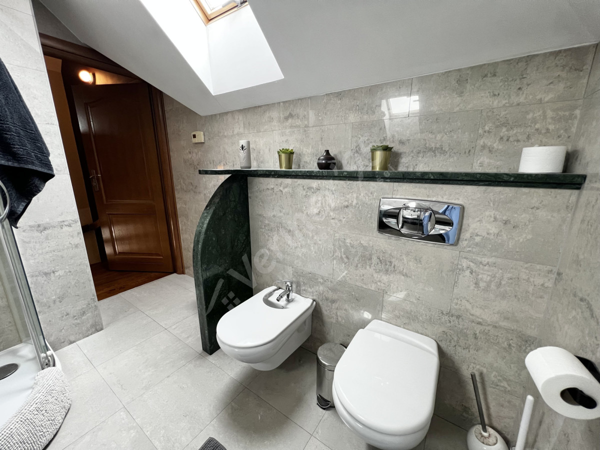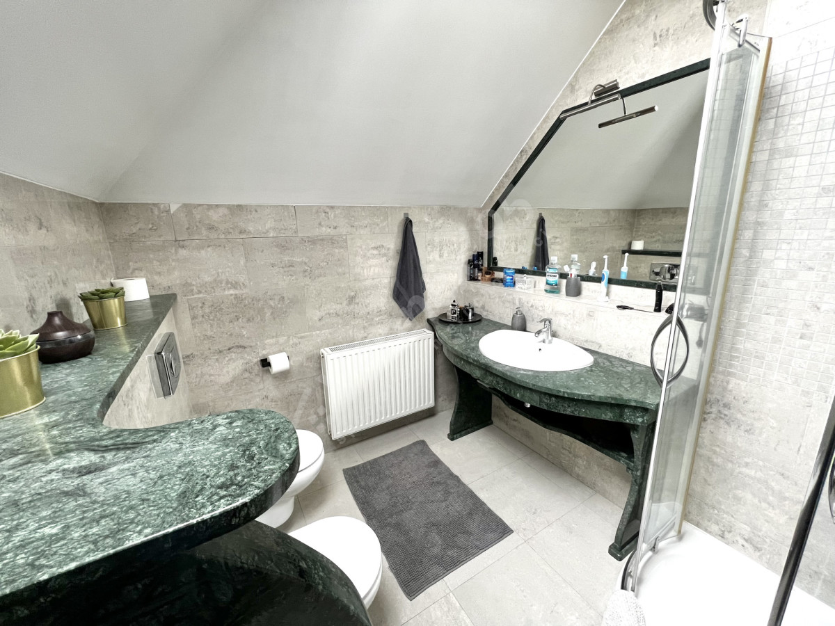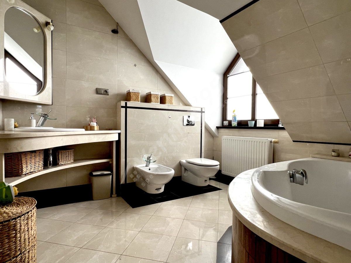 Piętro: 3 pokoje (w tym gabinet), 2 łazienki - jedna z narożną wanną, druga z marmurem i prysznicem