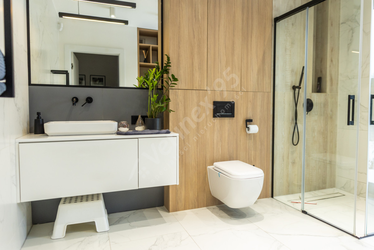 - Łazienka z prysznicem i zabudową stolarską