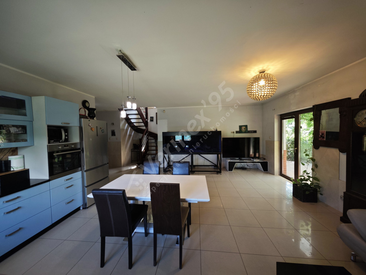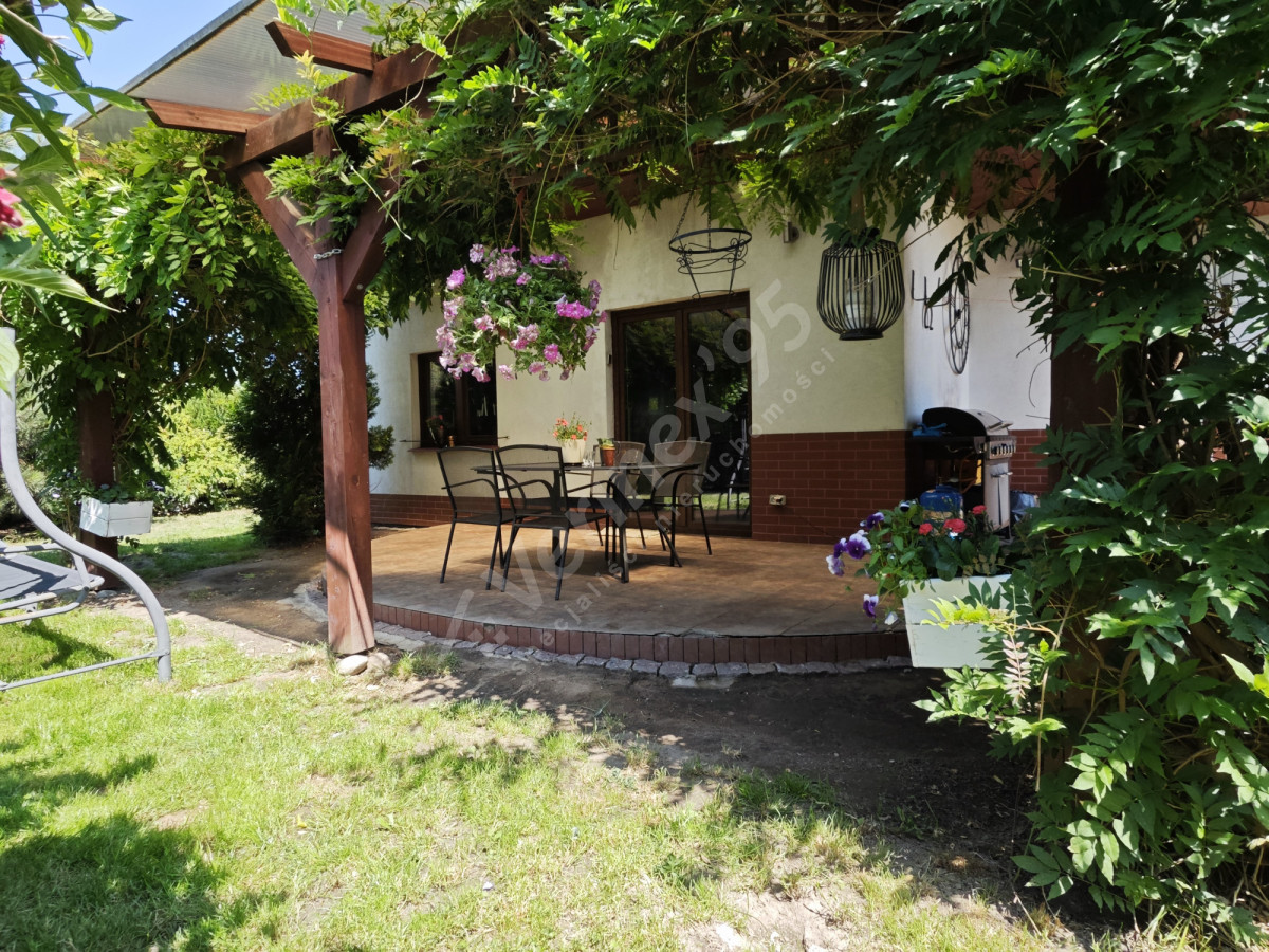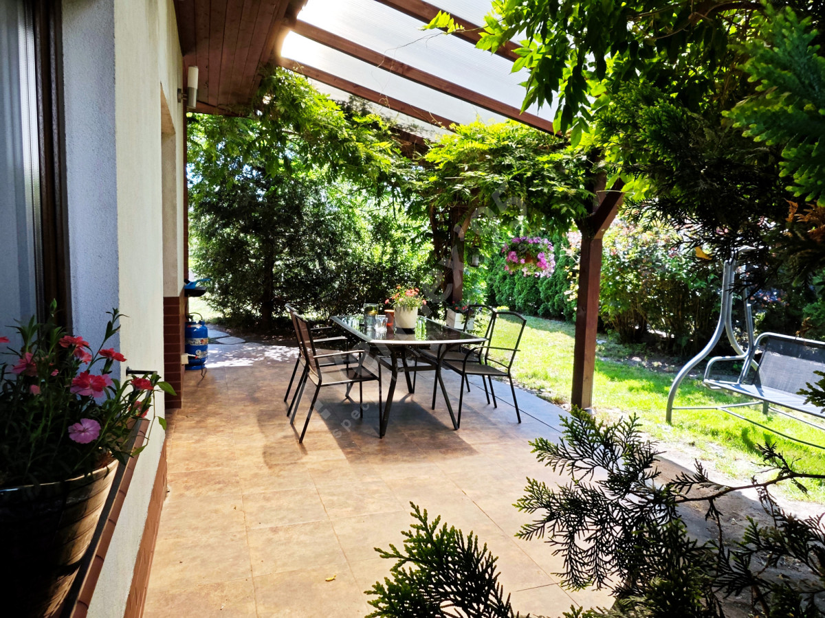 Na szczególną uwagę zasługuje obszerny salon z kuchnią w pełni wyposażoną z bezpośrednim wyjściem na przepiękny taras zadaszony konstrukcją drewnianą i dachem z przeźroczystego poliwęglanu zatopiony w zieleni, co stwarza niesamowity efekt i daje wyjątkowe warunki do spędzania wolnego czasu w intymności i ciszy.
