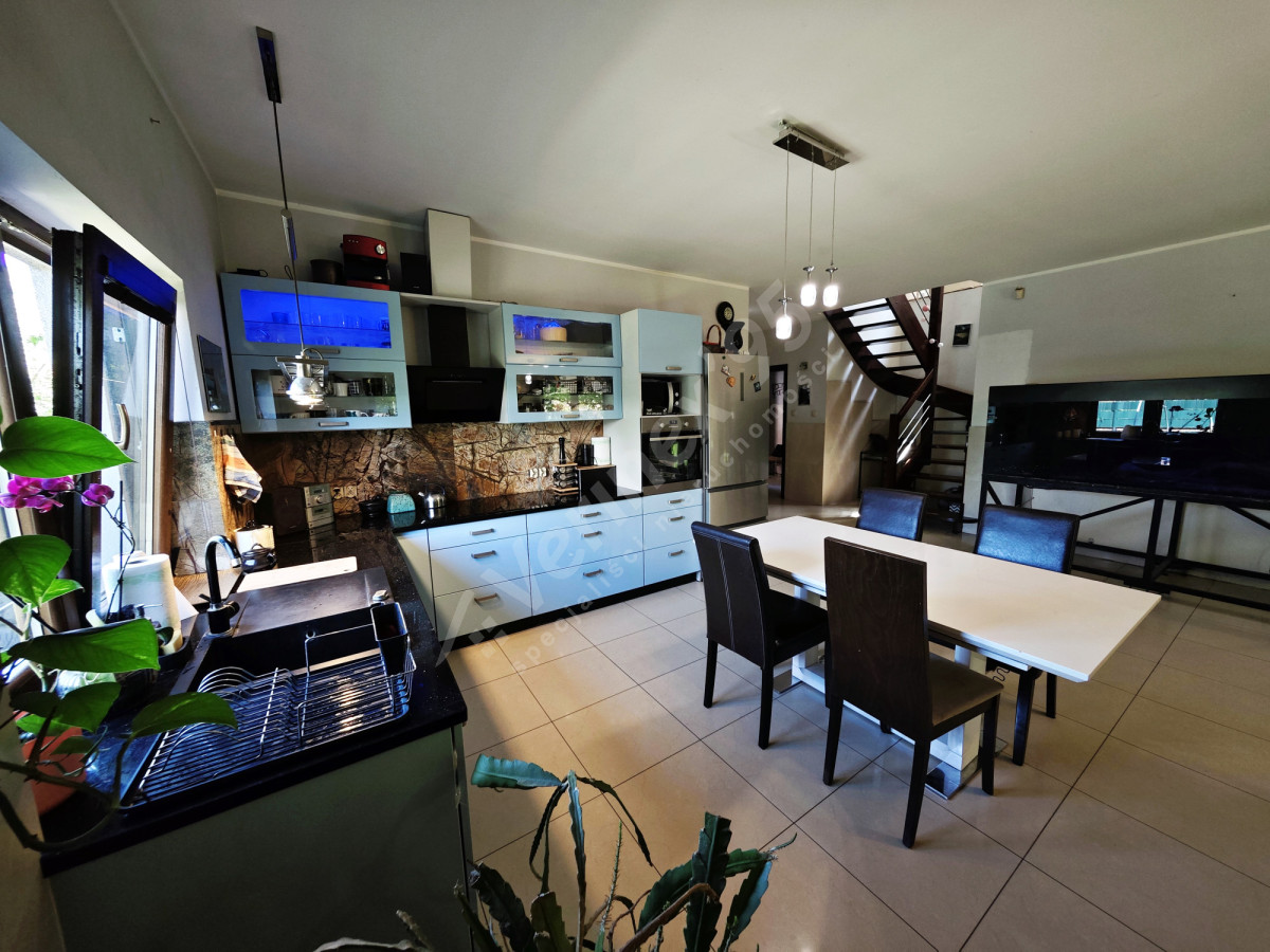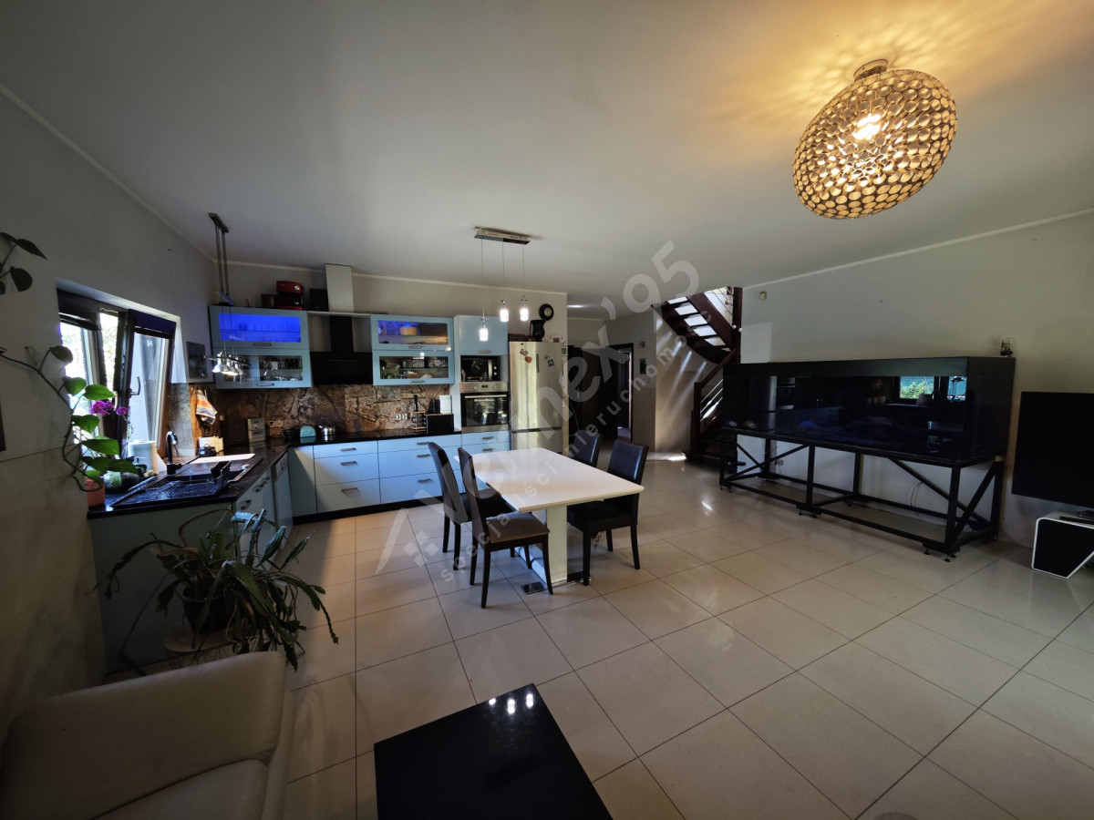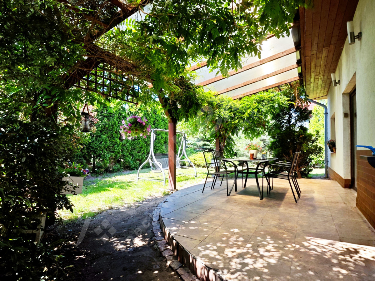 Na szczególną uwagę zasługuje obszerny salon z kuchnią w pełni wyposażoną z bezpośrednim wyjściem na przepiękny taras zadaszony konstrukcją drewnianą i dachem z przeźroczystego poliwęglanu zatopiony w zieleni, co stwarza niesamowity efekt i daje wyjątkowe warunki do spędzania wolnego czasu w intymności i ciszy.
