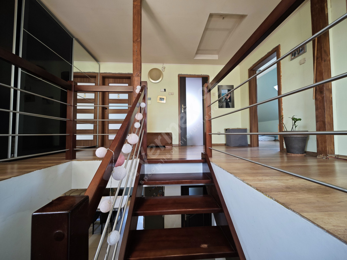 Na piętro prowadzą eleganckie drewniane schody, gdzie czekają dwie dodatkowe sypialnie, łazienka oraz otwarta przestrzeń antresoli, z której, jeśli zajdzie taka potrzeba, można w łatwy sposób zaaranżować dodatkową sypialnię, tak jak zostało to pierwotnie zaplanowane w projekcie.