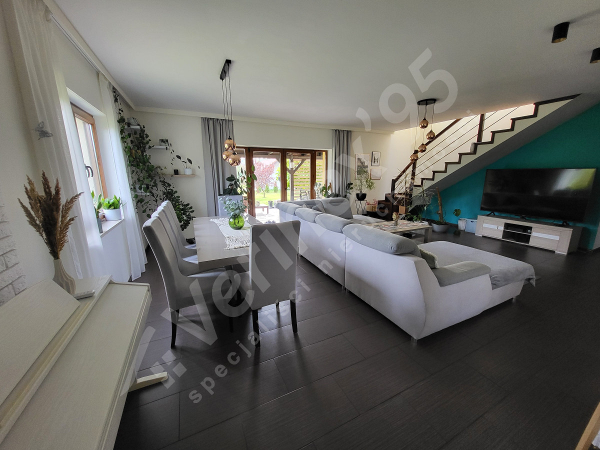 Na powierzchnie domu składa się część parterowa 123m2 w pełni wyposażona oraz część na piętrze 50m2 wg. norm/po podłodze 100m2 wszystko docieplone, w tzw. stanie deweloperskim do wykończenia finalnego pod tzw. klucz, a także dwa wolnostojące garaże, każdy o powierzchni ok.35m2.