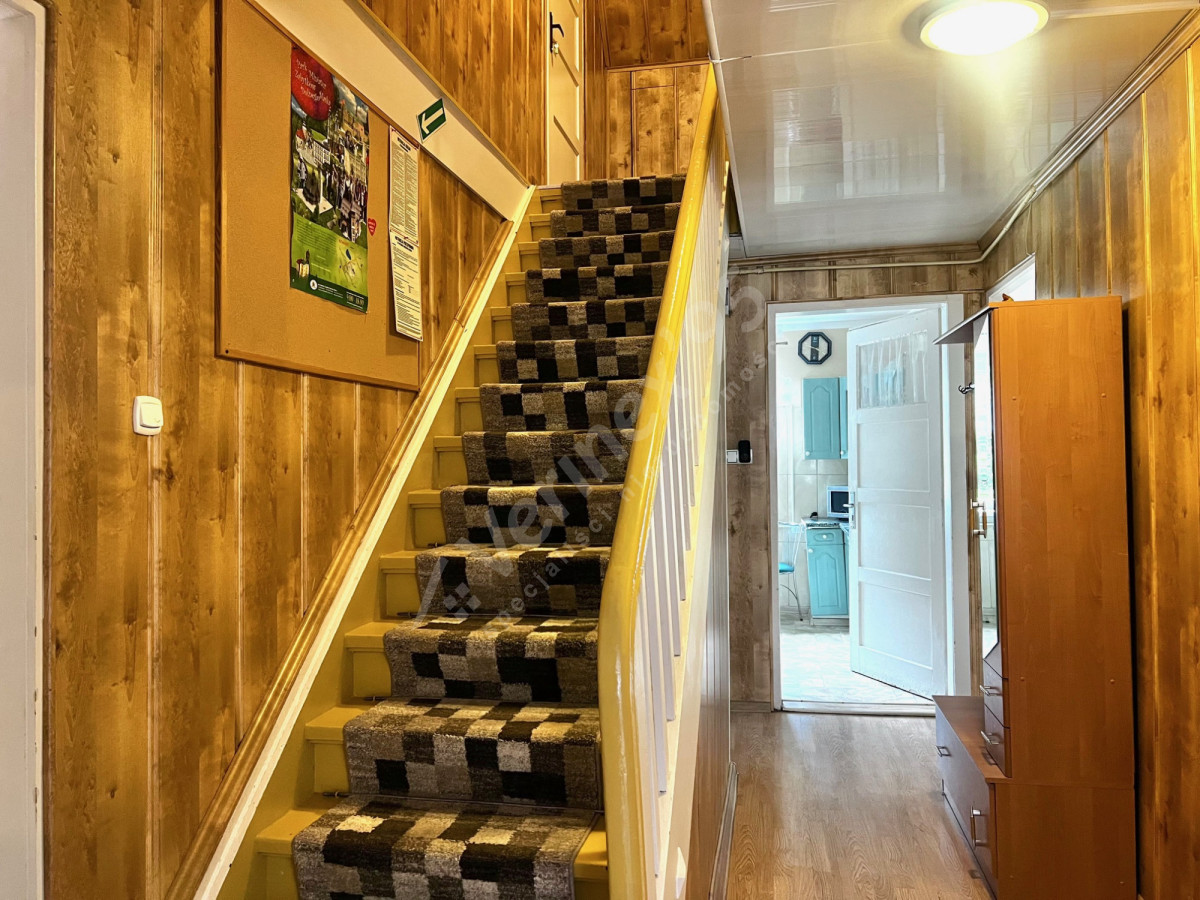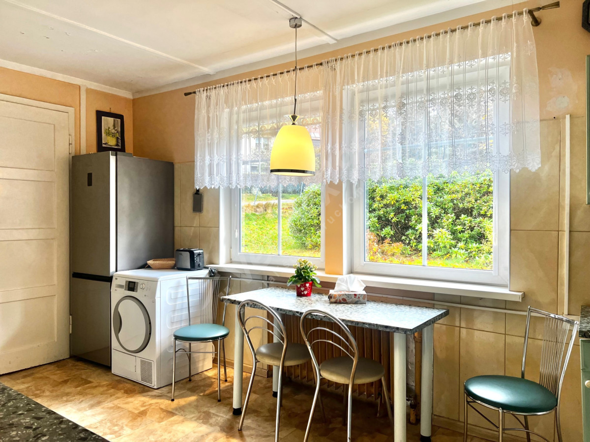 Na parterze znajduje się kuchnia z widokiem na ogród, przestronny salon, łazienka oraz pokój dzienny.