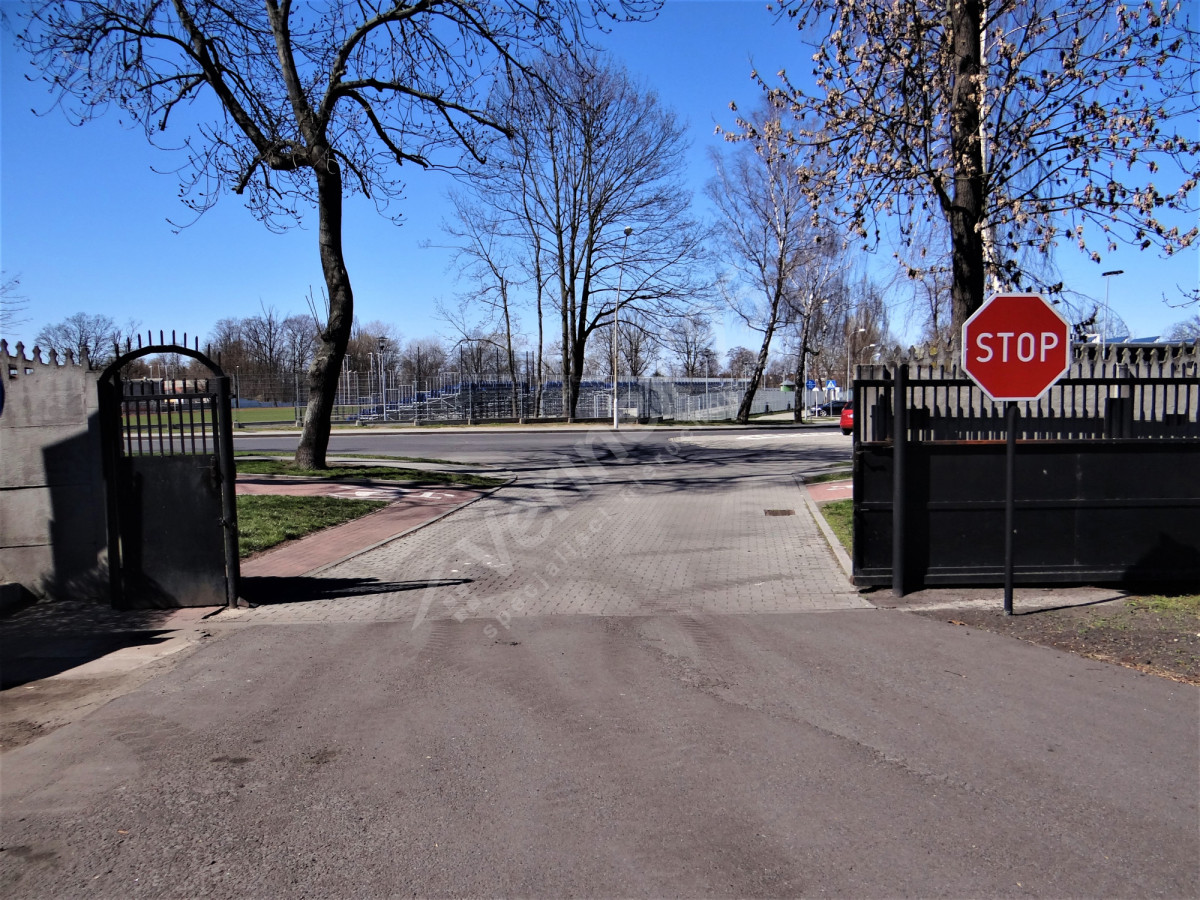 Działka częściowo utwardzona, ogrodzona przęsłami betonowymi oraz panelami metalowymi.