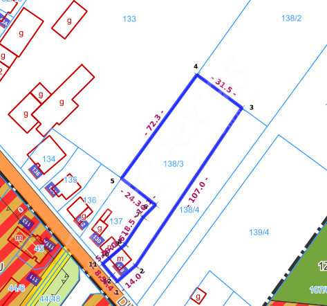 Kształt: od drogi pas o szerokości ok. 13m i ok. 45 głębokości, pozostała część działki w kształcie dużego prostokąta o wymiarach 72,3x31,5 m.