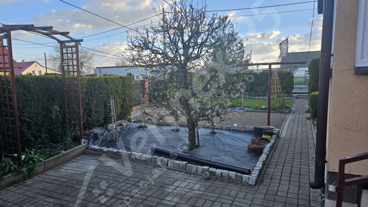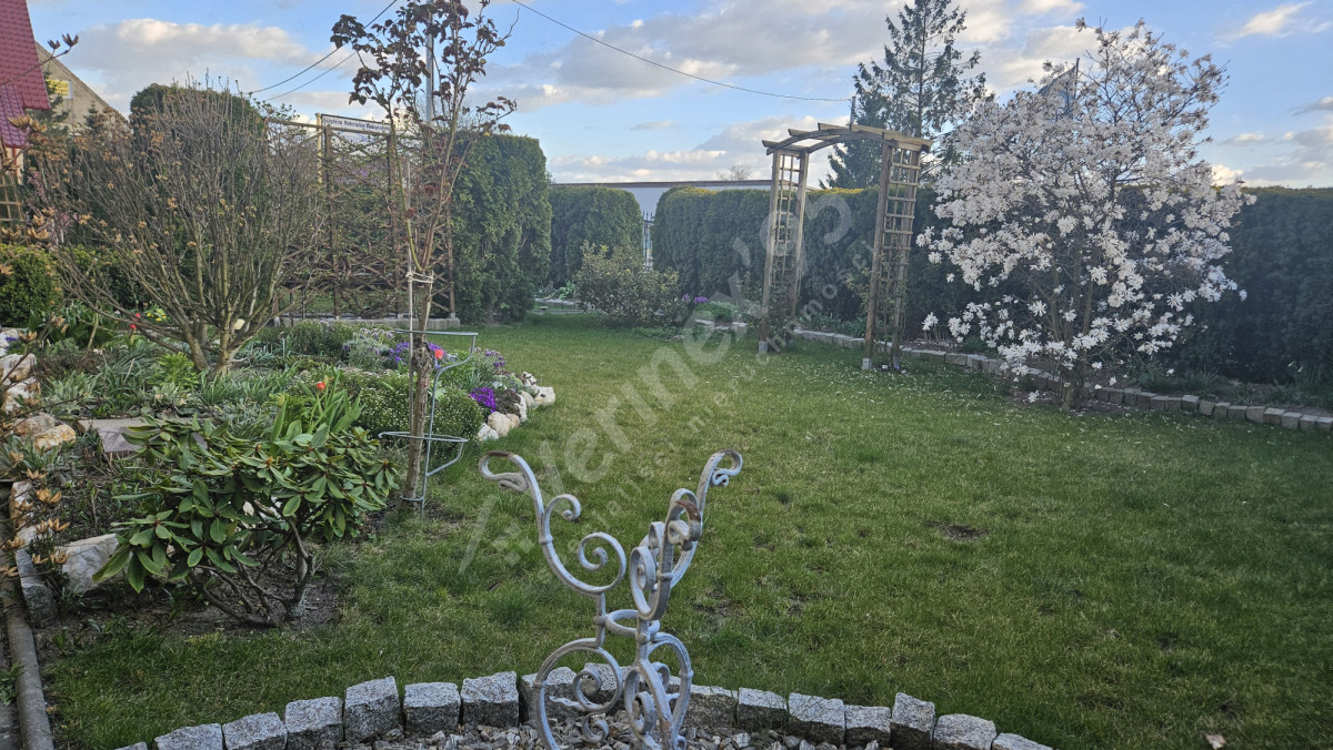 Ogród o pow. 3 a, grunt przynależny do mieszkania to 5 a, na pozostałych 2 a znajdują się 2 garaże, 2 komórki.