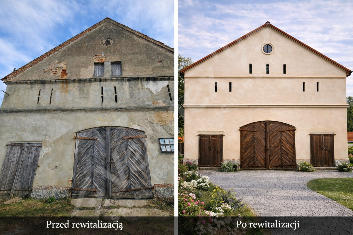 5. Stodoła z XIX wieku - ok. 790m2 budynku (licząc po obrysie). Położona we wschodniej pierzei placu; budynek odpowiedni do adaptacji na funkcje związane z działalnością usługową lub rekreacyjną.