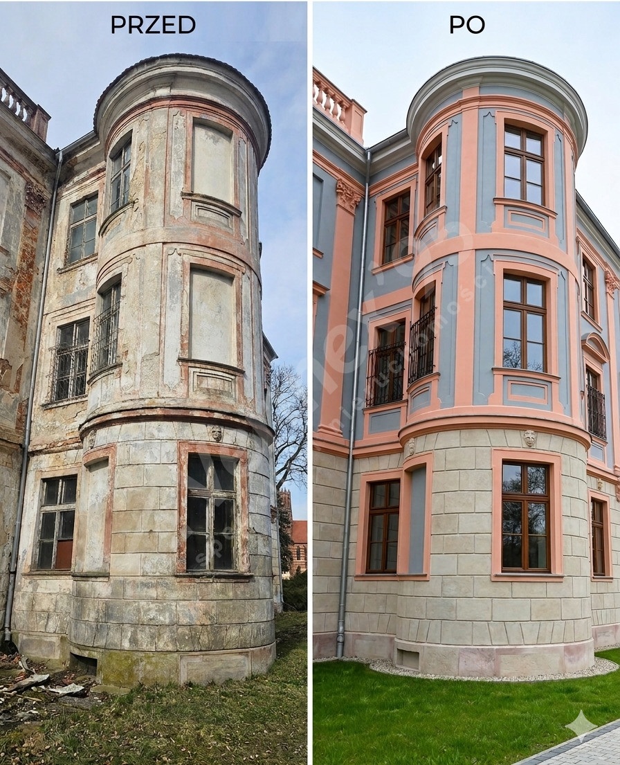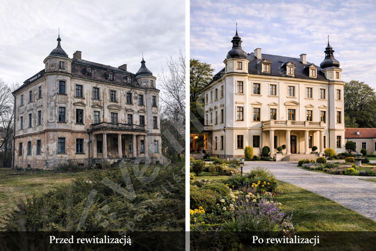 1. Pałac - około 1700 metrów kwadratowych, trzy kondygnacje oraz poddasze, wzniesiony na planie prostokąta, z charakterystycznymi wieżami w narożach oraz oryginalnymi elementami dekoracyjnymi, jak stiuki i kamienne balustrady. Obiekt o potencjale adaptacji na funkcje hotelowe, konferencyjne, edukacyjne, zdrowotne, a także może spełniać funkcję biura lub ekskluzywnej rezydencji.